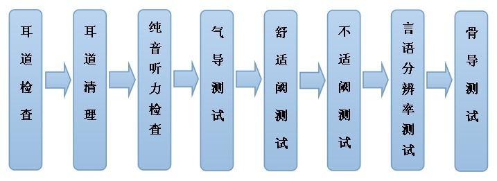 纯音测听(成人):针对250-8000HZF范围内不同声音频率进行气、骨导的测试,受试者听到声音就反应,根据测试结果判定患者听力损失程度及听力损失的类型。还有舒适阈、不适阈及言语分辨率的测试。行为测听(儿童):针对不能配合做纯音测听的儿童,需在医院做全面的听力检查(脑干诱发电位、多频稳态、颞骨CT等等),佩戴助听器时配合做听声看物的测试,并有不同频率的相关乐器做相应的测试。